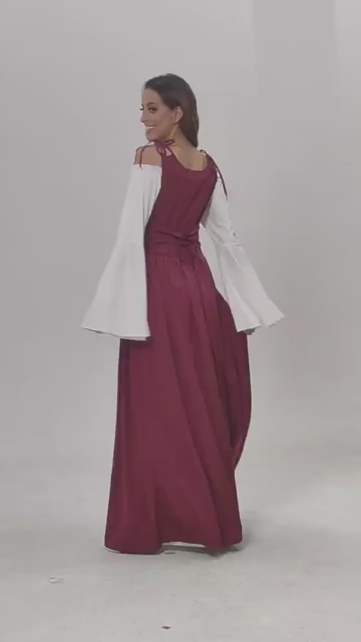 It adopts a square neck design, with cross lacing at the chest to cinch the waist, which can not only modify the figure, but also restore the classic corset details of medieval clothing; the inner lining of the top is off-white, and the outer skirt is a colored (black/dark blue/green/wine red, etc.) suspender-style outer skirt, with distinct layers; the sleeves are in an exaggerated flared sleeve shape, elegant and flexible, adding a sense of romance; the lower skirt is an off-white layered swing skirt with good drapability, stretching like waves when walking. The overall shape is both classical and artistic, matching the fantasy and elegance of the medieval theme.